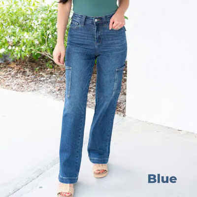 CARGO-INSPIRED DESIGN: These jeans feature a trendy cargo-inspired style with spacious pockets, adding a practical yet fashionable element to your look. The beautiful dark/light washes make them perfect.